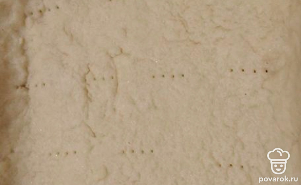 Тесто раскатать, выложить в форму. Наколоть вилкой и отправить в разогретую духовку на 10 минут при 180 градусах.