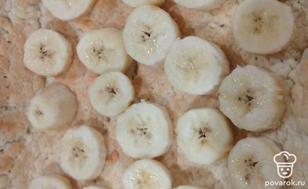 На тесто выложить нарезанные кружочками бананы.