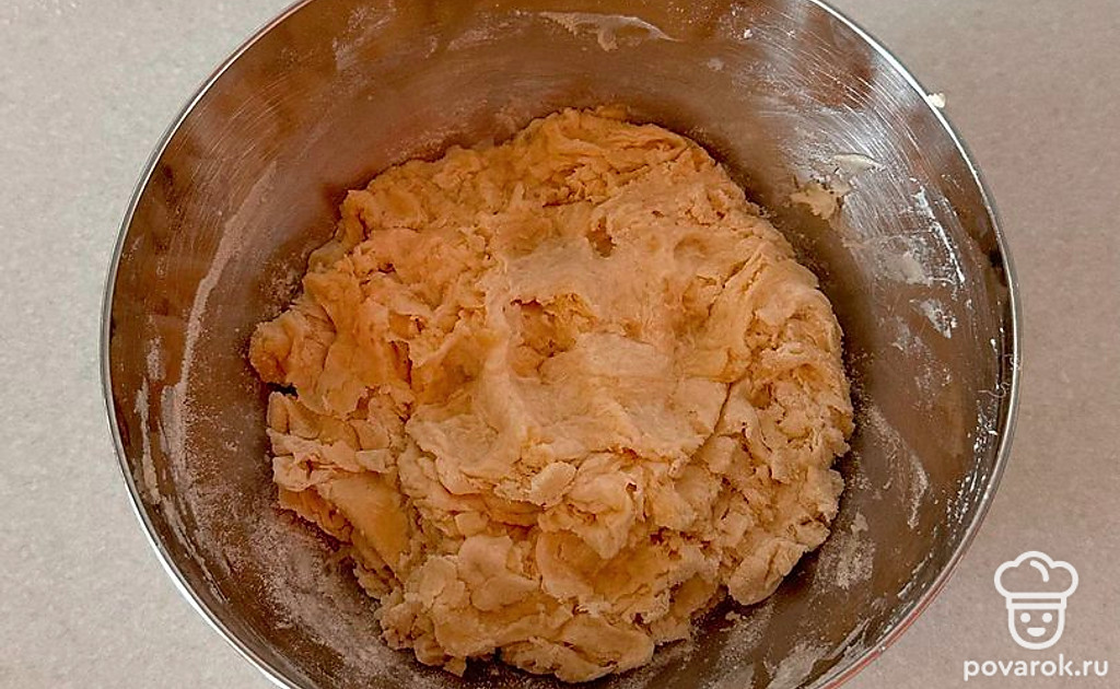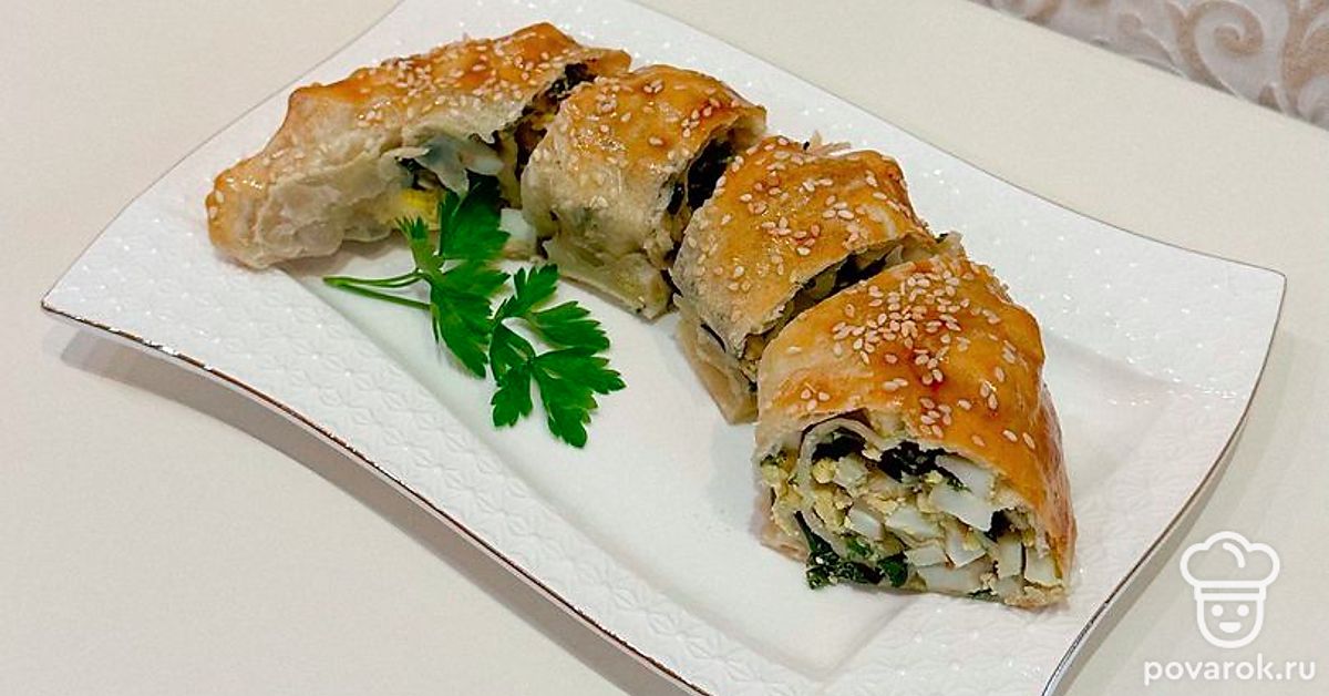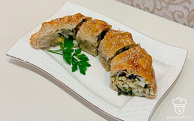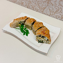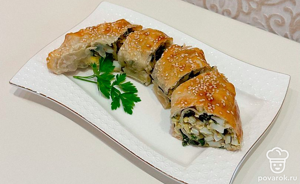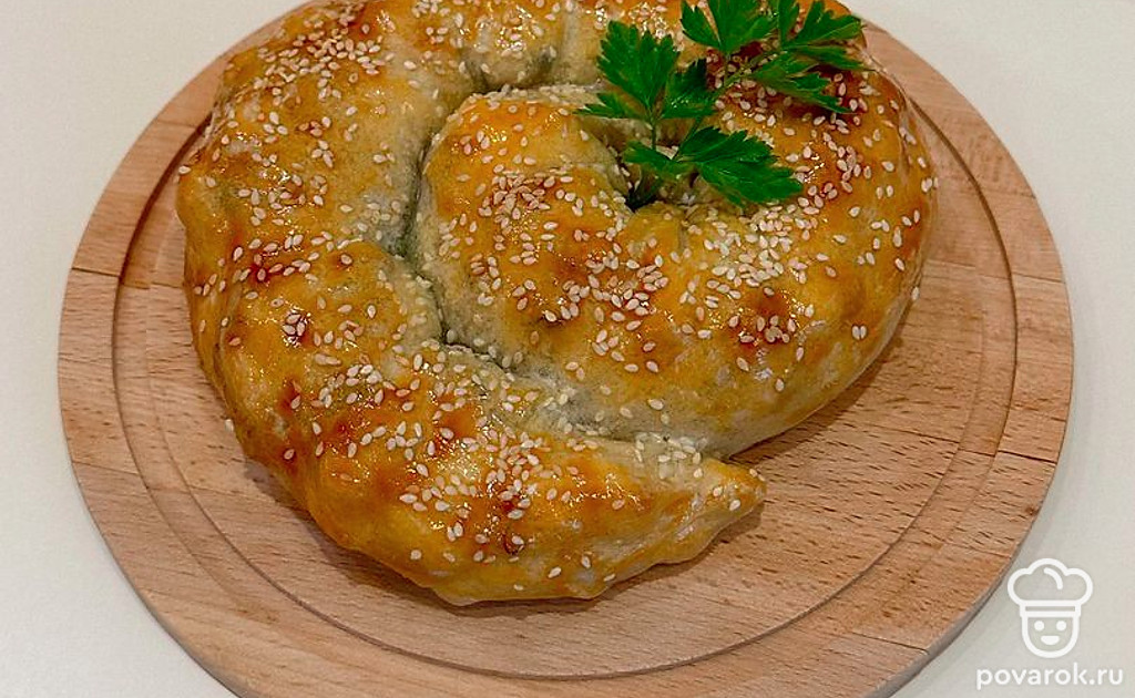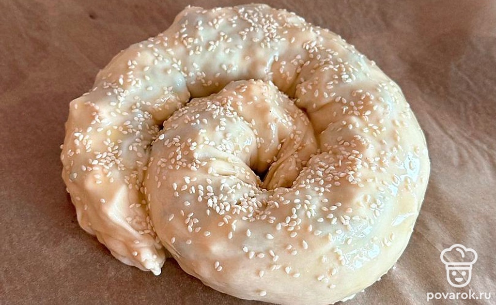 Заверните длинный рулетик и сложите его в ракушку. Смажьте яичным желтком и присыпьте кунжутом. Выпекайте при температуре 220 градусов на режиме «верх-низ» без конвекции 20 минут.
