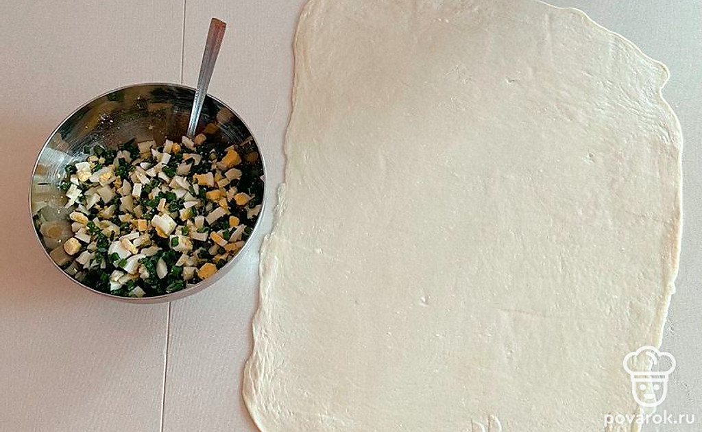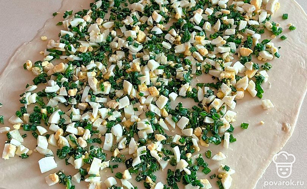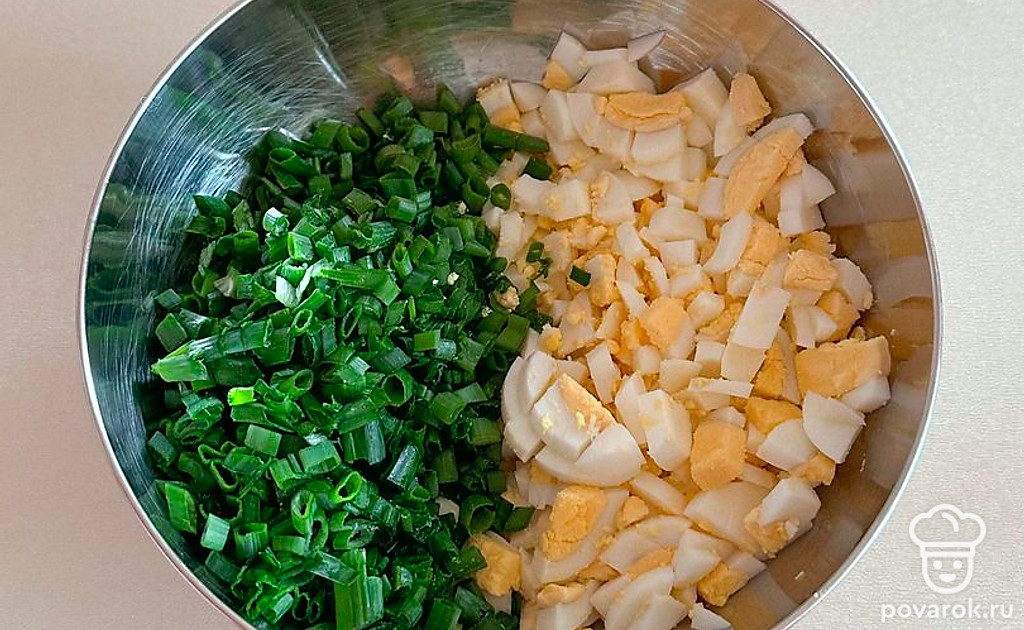 В это время нарежьте яйца и зелень, примерно в пропорции 1 к 1. Посолите начинку и перемешайте.