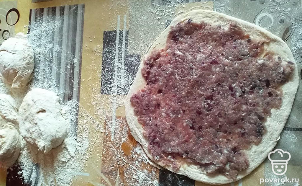 Тесту дать отдохнуть, затем раскатать в тонкий блин и размазать по нему фарш. Скатать блин в рулет, порезать порционно.