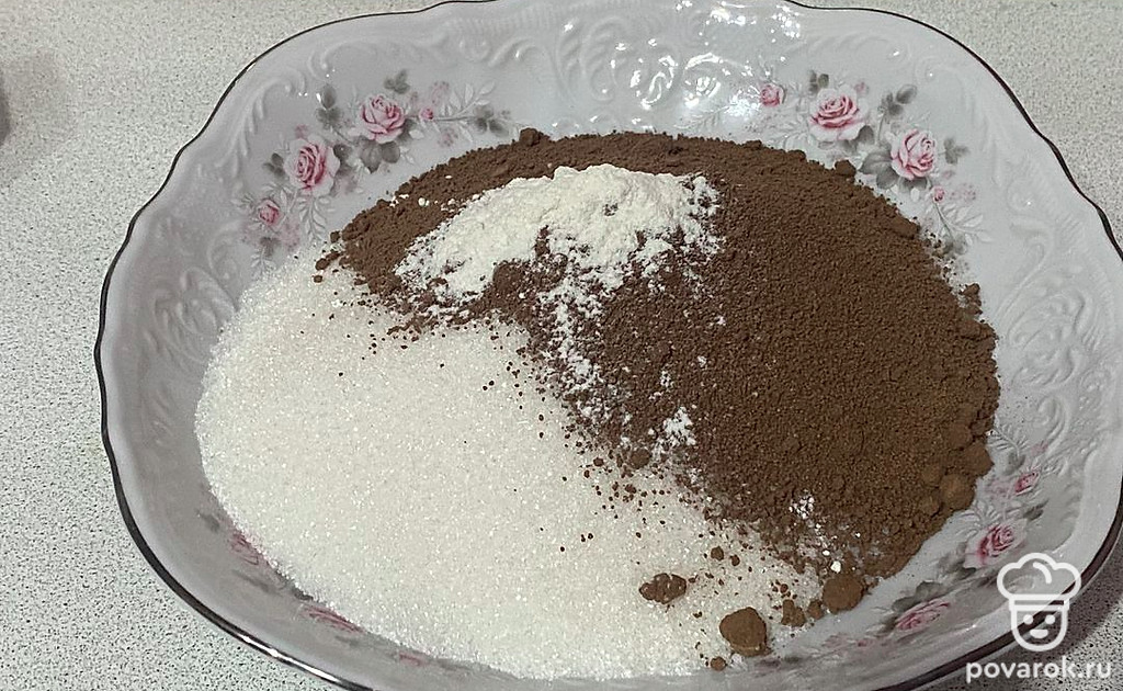 В глубокой чаше перемешайте какао, сахар, муку и разрыхлитель.