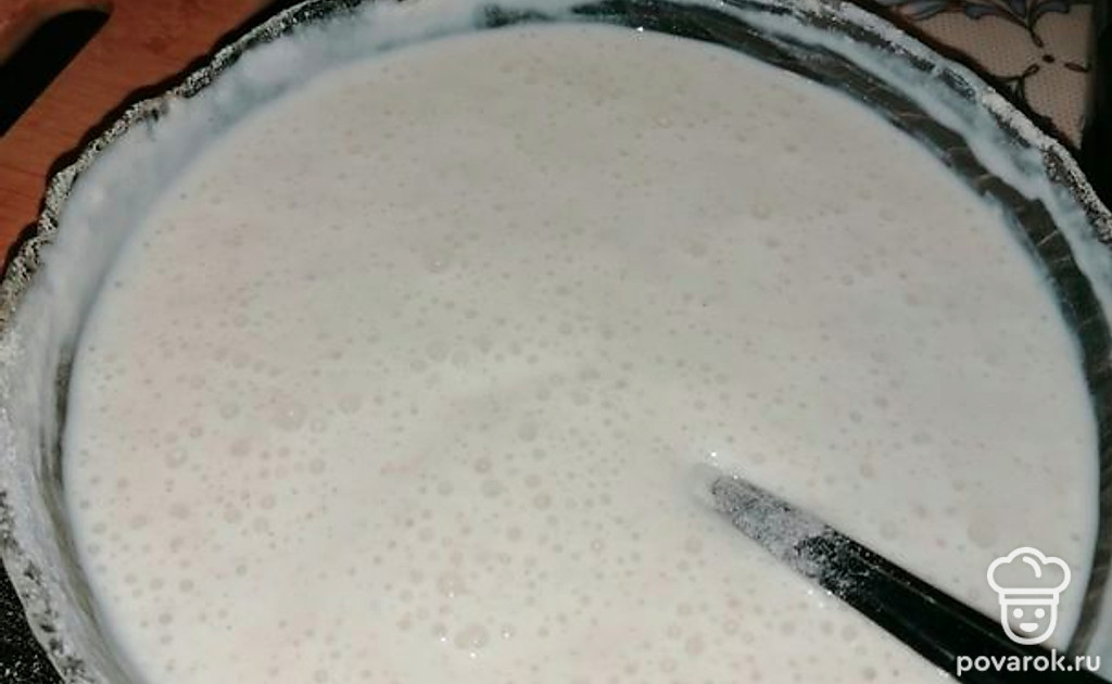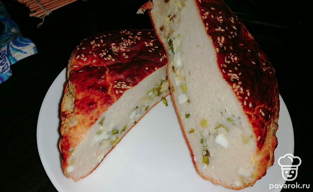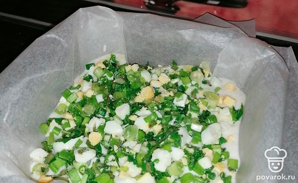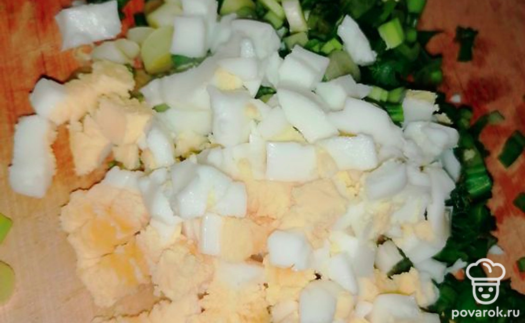 Подготовить начинку, она может быть любой. У меня лук и яйцо. Смешать кефир с содой, дать немного постоять.