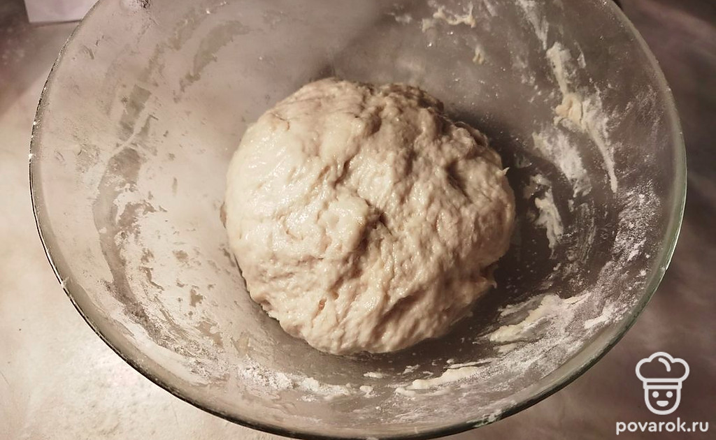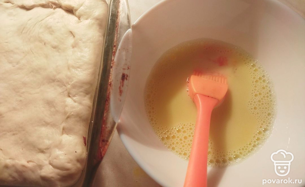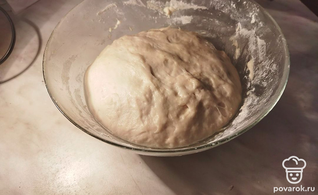 Когда тесто увеличится в объеме в 2 раза, можно начинать формировать пирог. Разделяем тесто на 2 неравные части.