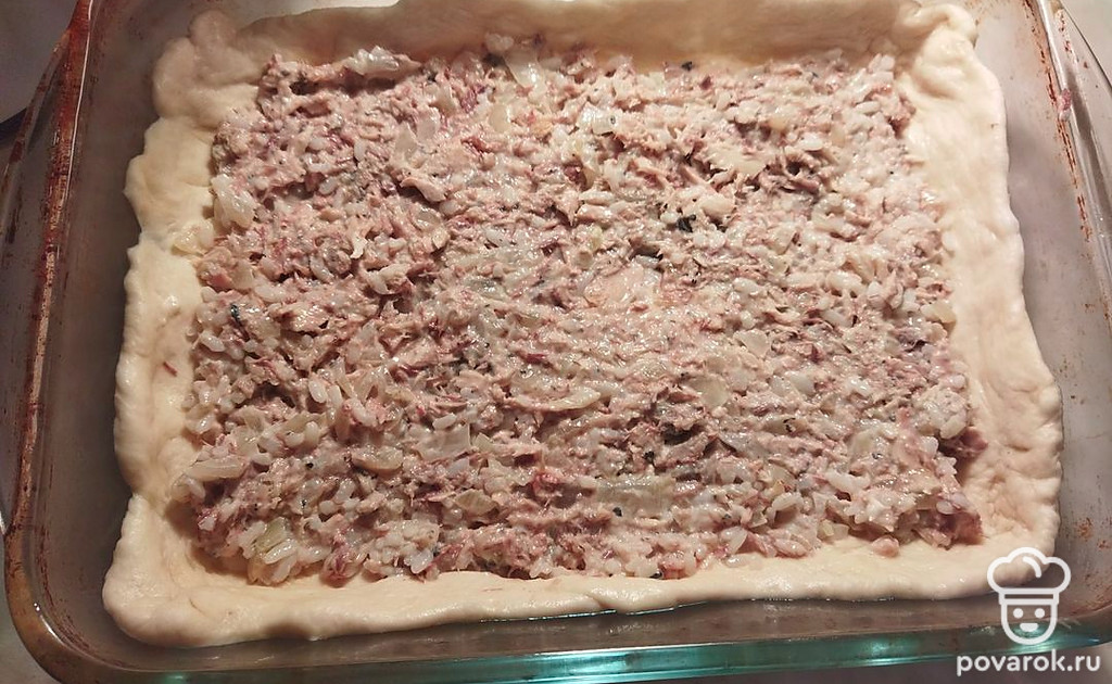 Большую часть раскатываем, выкладываем в форму для запекания, формируя бортики. Сверху выкладываем начинку.