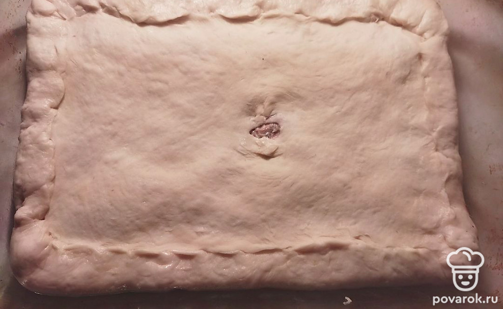 Теперь осталось накрыть второй половиной теста, защипнуть края и оставить для подъема на 15 минут. Посередине делаем небольшое отверстие для воздуха, чтобы пирог не вздулся.