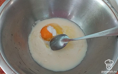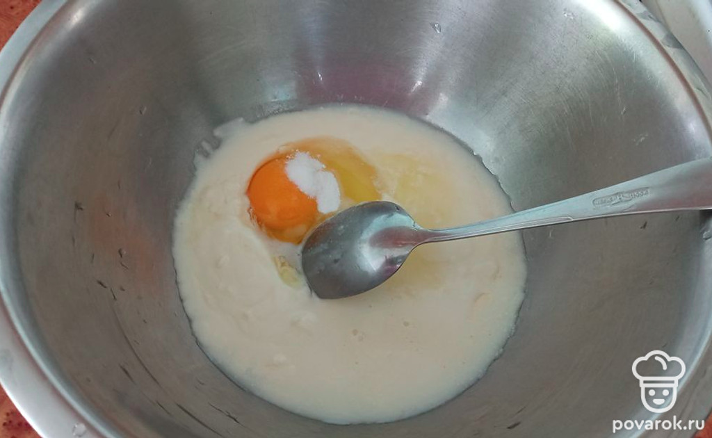 Делаем тесто. Смешиваем кефир, растительное масло, яйцо, соду и муку.