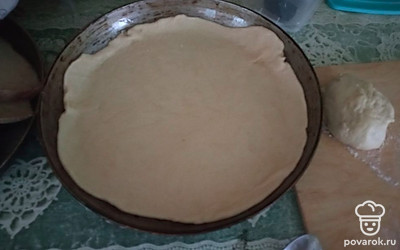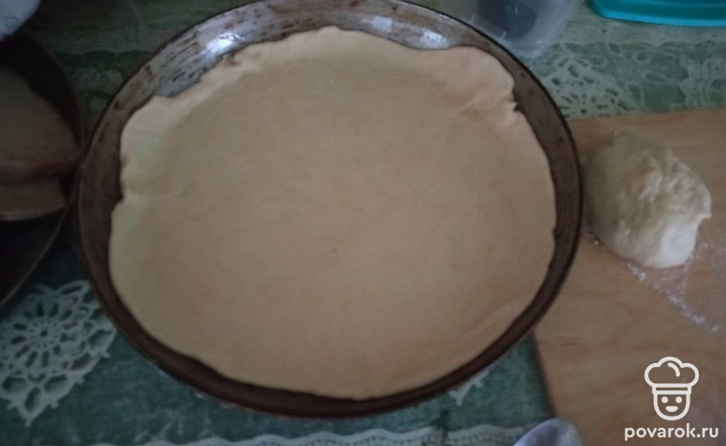 Делим тесто на 2 части, раскатываем и выкладываем в форму.