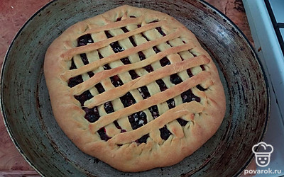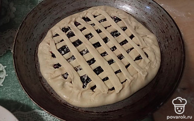 Сверху делаем из теста плетенку или решетку. Смазываем яйцом и отправляем в духовку при 180 градусах на 30 минут.
