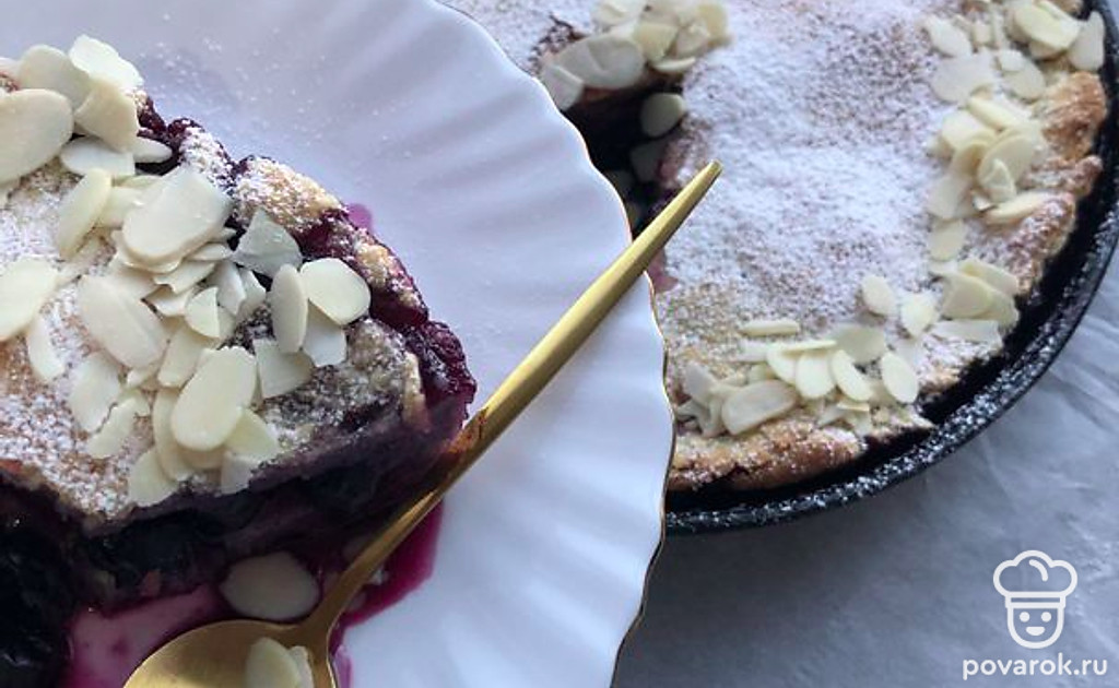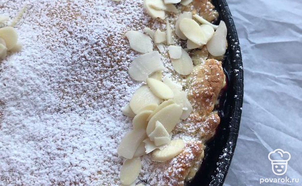 Посыпаем сахарной пудрой и по краю посыпаем миндальными лепестками.