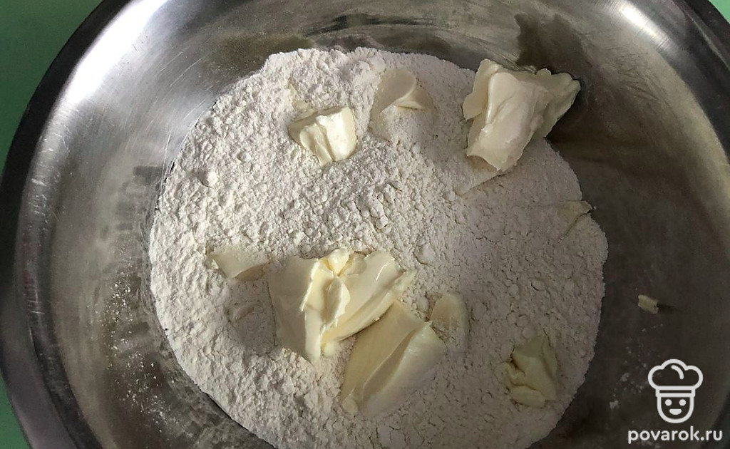 Смешиваем муку, разрыхлитель, соль и кусочками добавляем масло.