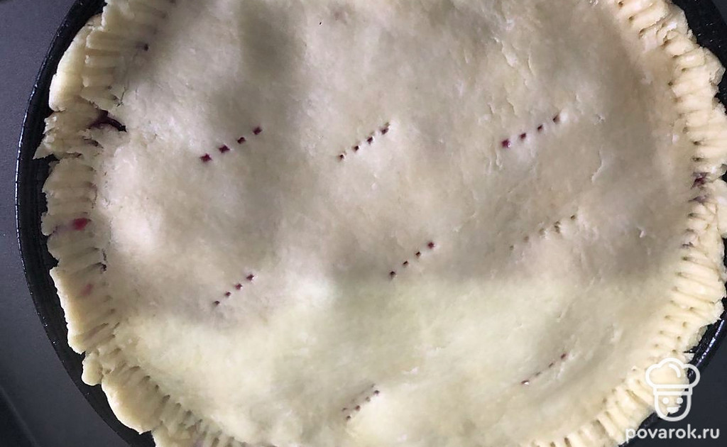 Накрываем сверху оставшимся раскатанным тестом и делаем зажимы вилочкой и протыкаем сверху в нескольких местах.