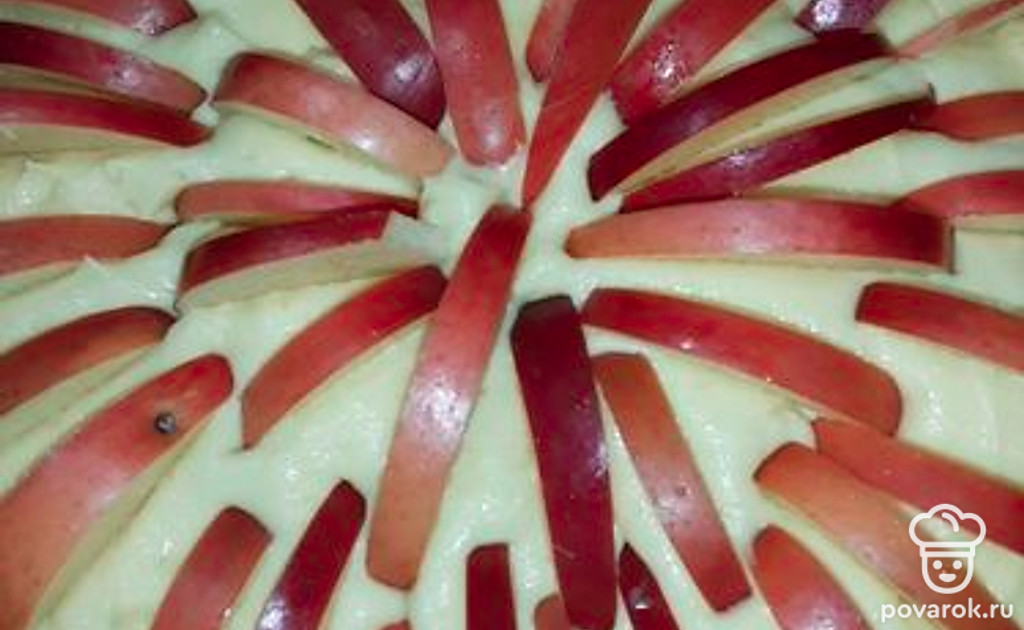 Вливаем тесто в форму для выпечки и украшаем яблоками. Готовим в разогретой до 180 градусов духовке около 40 минут.
