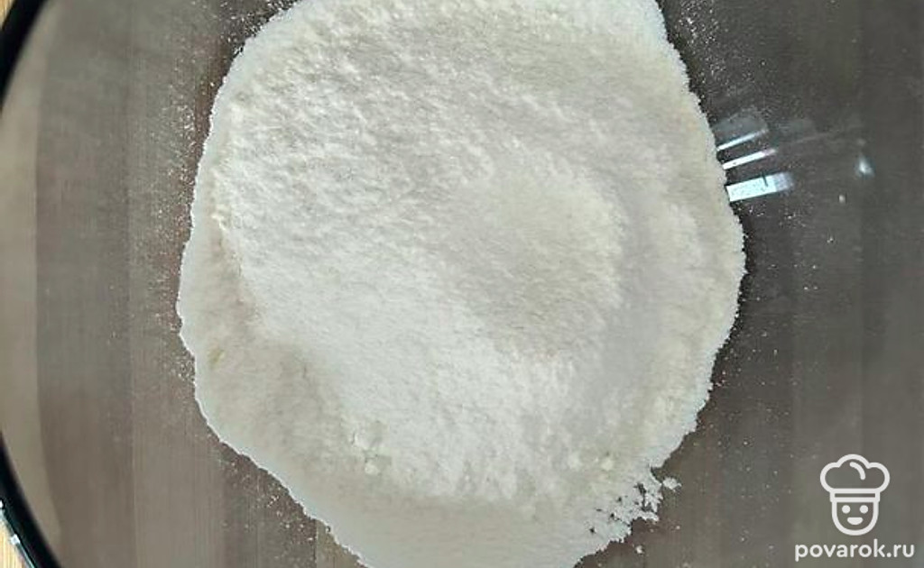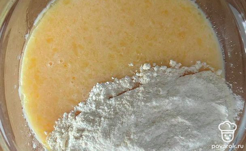 Добавляем смешанную муку с разрыхлителем. Взбиваем тесто до однородности.