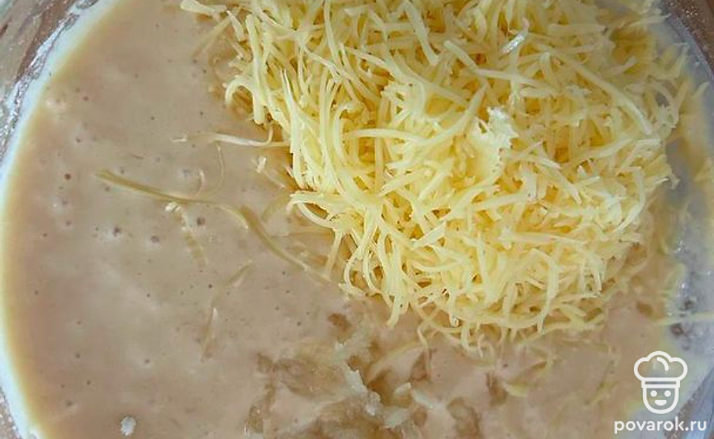 Натираем сыр на мелкой терке. Чеснок пропускаем через пресс и смешиваем с тестом.