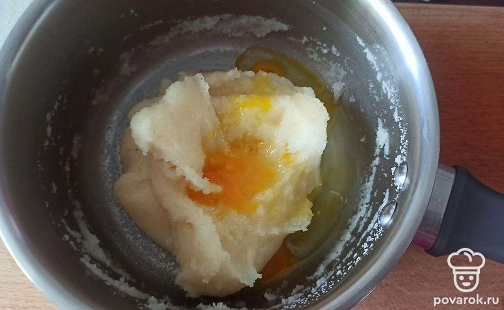 Манную кашу залейте молоком и отварите в течение 10 минут. Когда каша немного остынет (дайте постоять минут 5-10), вбейте туда яйцо и перемешайте.