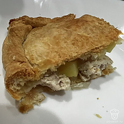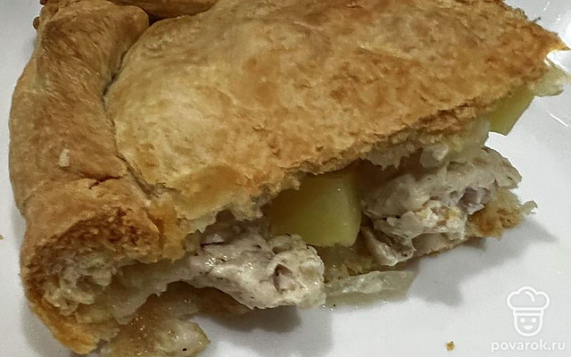 Накрываем вторым слоем теста и углы со всех боков закрепляем. Посредине делаем отверстие. Ставим на 40 минут в духовку при 200 градусах в предварительно разогретую духовку. Выпекаем, даем остыть 5 минут.