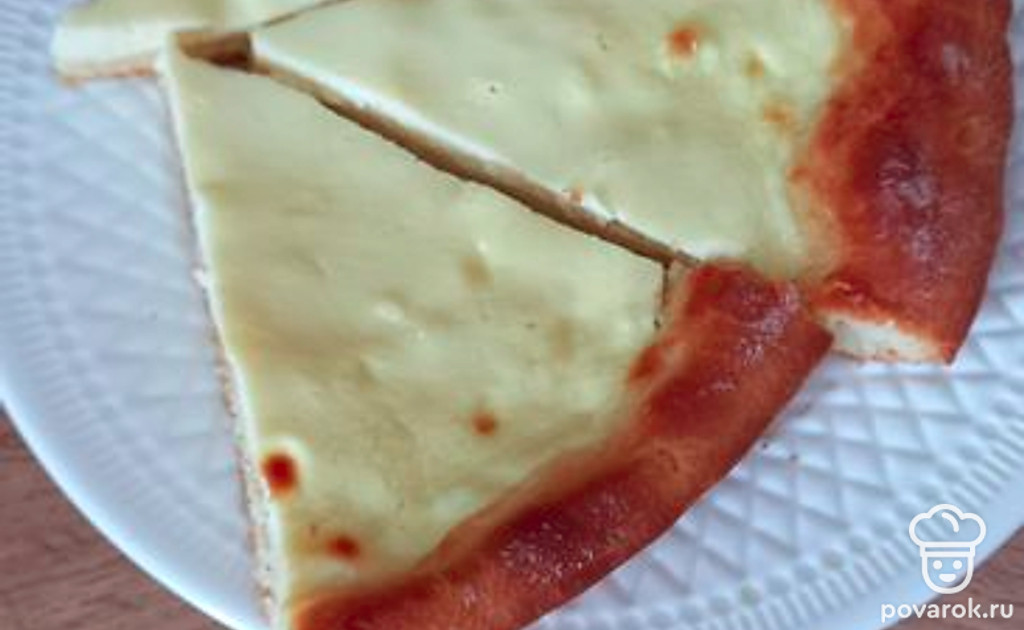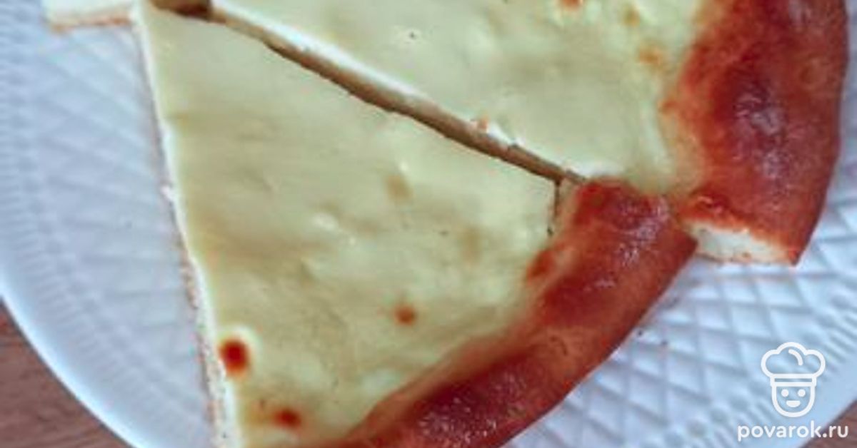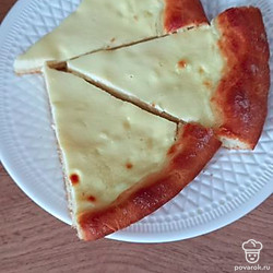 Готовим начинку. Сметану 500 грамм смешиваем с 4 яйцами и 2 столовыми ложками сахара (можно добавить по вкусу), выливаем на готовое тесто в сковороде.