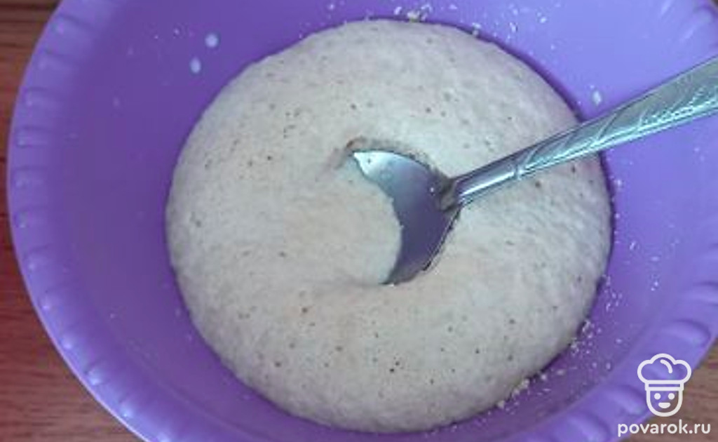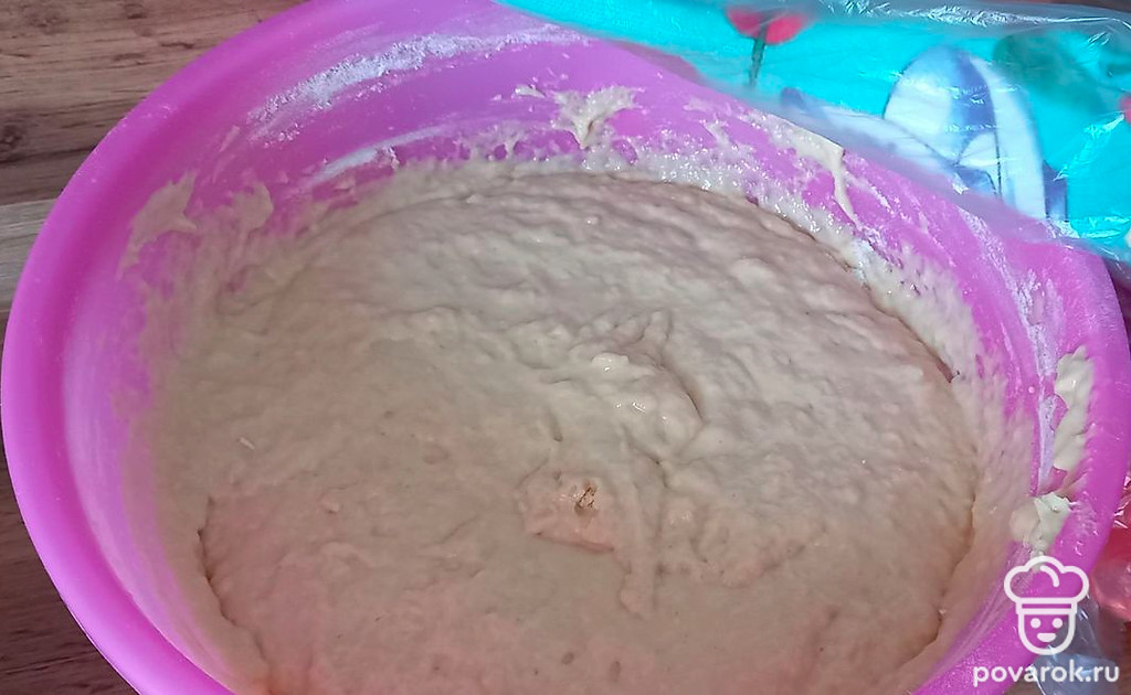 Должно получиться слегка липкое тесто. Ставим в теплое место, чтобы тесто поднялось.