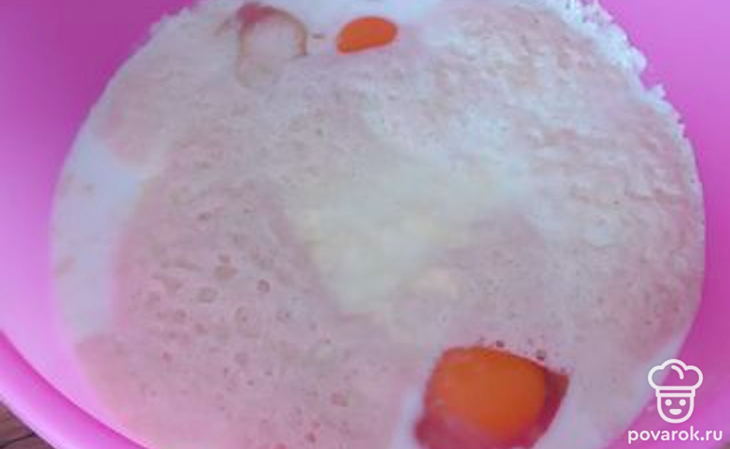 Пока поднимается опара, замешиваем тесто. К 2 яйцам добавляем 1 столовую ложку сахара, 1 чайную ложку соли, 50 грамм растопленного сливочного масла, опару, примерно 500 грамм муки.