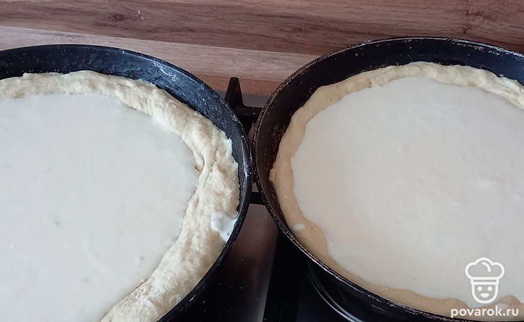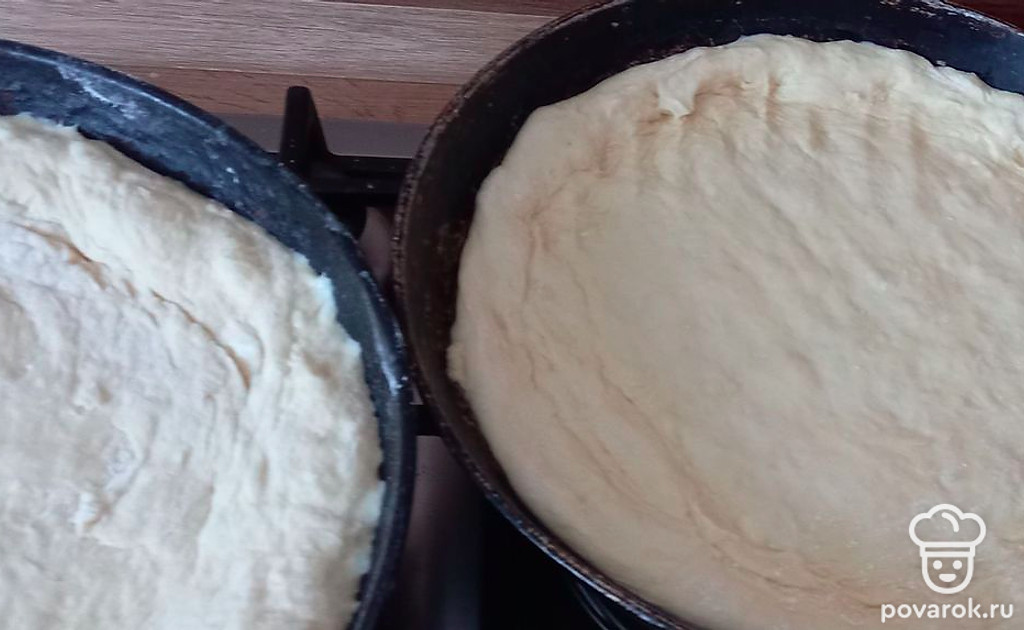 Когда тесто поднимется, делим его на 2 части и перекладываем на две небольшие сковородки. По краям формируем бортики, чтобы начинка не вылилась.