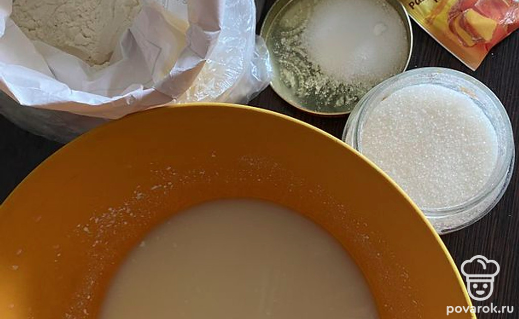 Смешать муку, кефир, сметану, разрыхлитель, одно яйцо, соль до однородности.