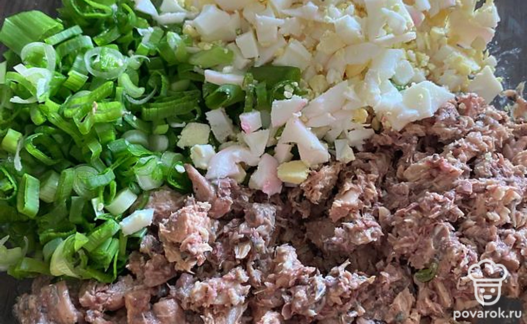 Для начинки смешать банку рыбных консервов размятых вилкой, два вареных порезанных яйца, и мелко нарезанный зелёный лук.