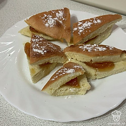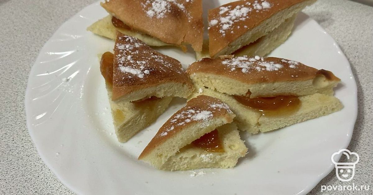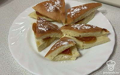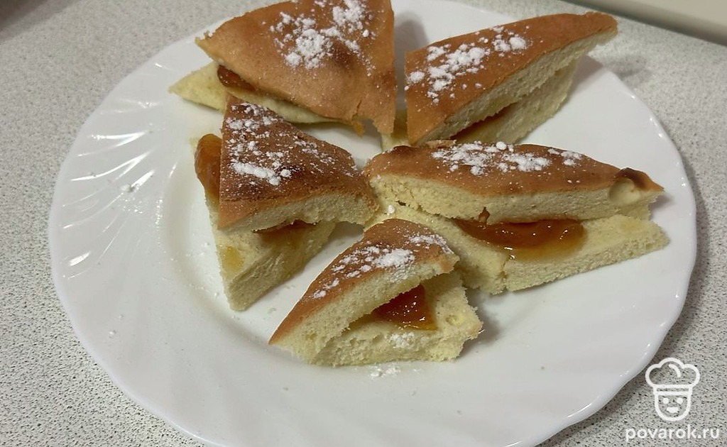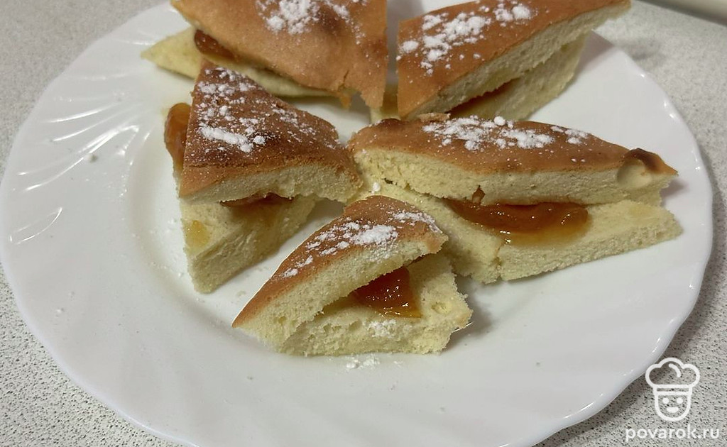 Разрезаем готовый пирог на кусочки. Каждый смазываем вареньем.