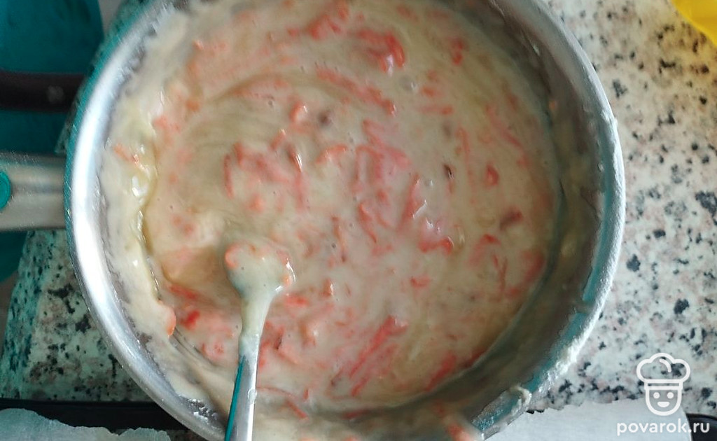 Высыпаем муку, добавляем тертую морковь и сушеный тертый сельдерей.