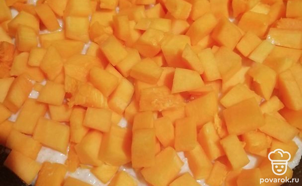 В смазанную маслом и посыпанную панировочных сухарями форму выложить слой пшенной каши, затем слой мелко нарезанной тыквы и сверху снова слой каши. Разровнять, смазать сметаной и запекать в духовке в течении 30 минут.