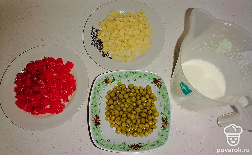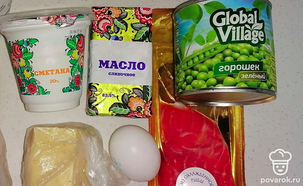 Начинка. Рыбу и сыр режем кубиком. В отдельной миске смешиваем яйцо и сметану. С горошка сливаем жидкость.