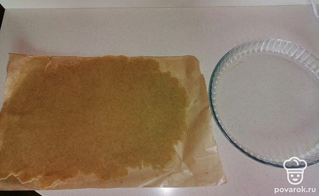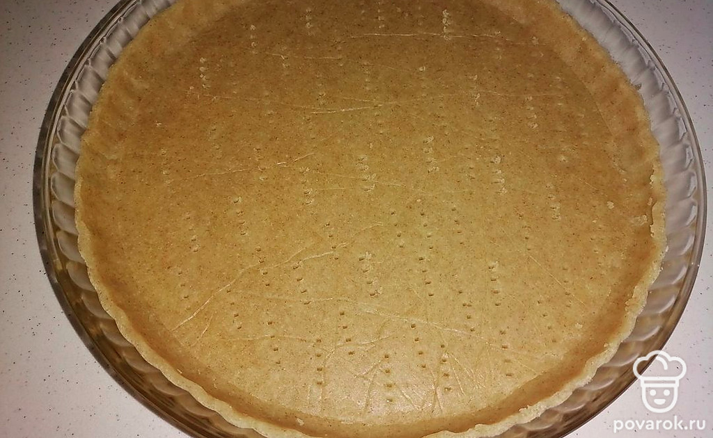 Делаем тарталетку. Вырезаем тесто по форме для выпечки и распределяем его по дну. Делаем бортики. Накалываем вилкой. Песочную основу необходимо подморозить перед выпечкой в течение получаса. Выпекаем песочную основу при температуре 170 градусов в течение 15 минут до легкого золотистого цвета.