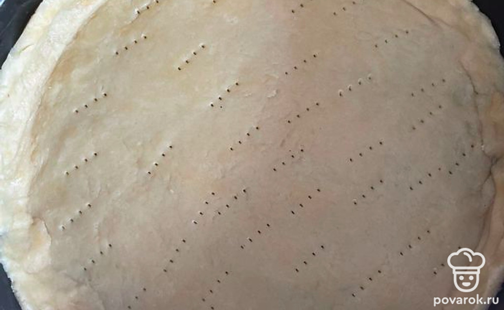 Выложить в форму и проткнуть вилкой, засыпать горохом, чтобы тесто не поднялось. Выпекать в духовке 15 минут.