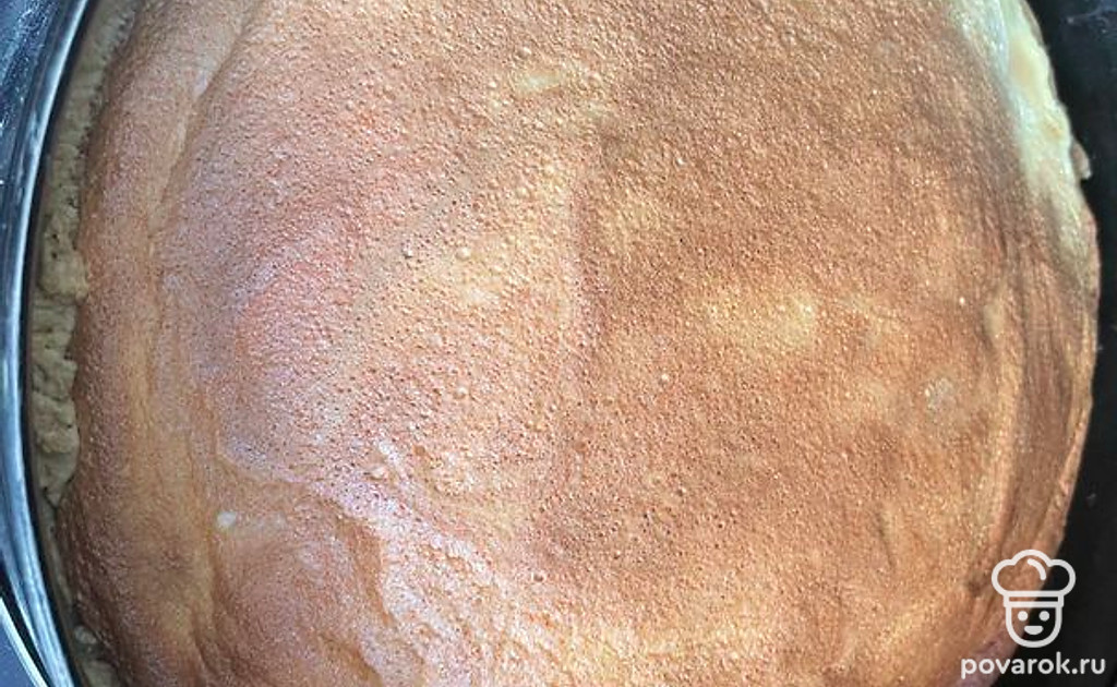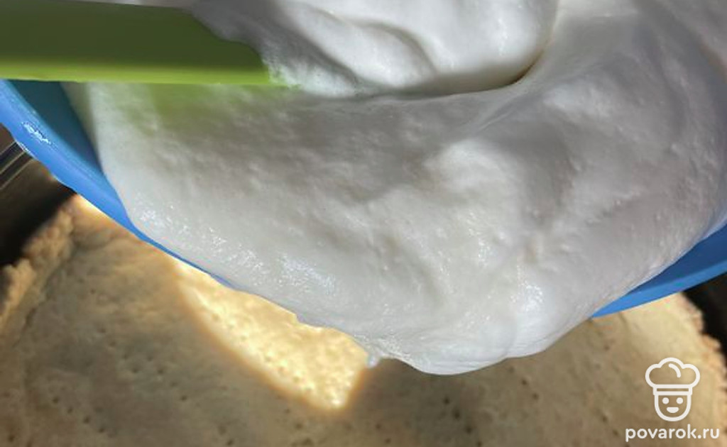 Взбить яйца с сахаром. Можно отдельно белки, отдельно желтки. Смешать с ванилином и сметаной до пышной пены. Выложить на остывшее тесто.