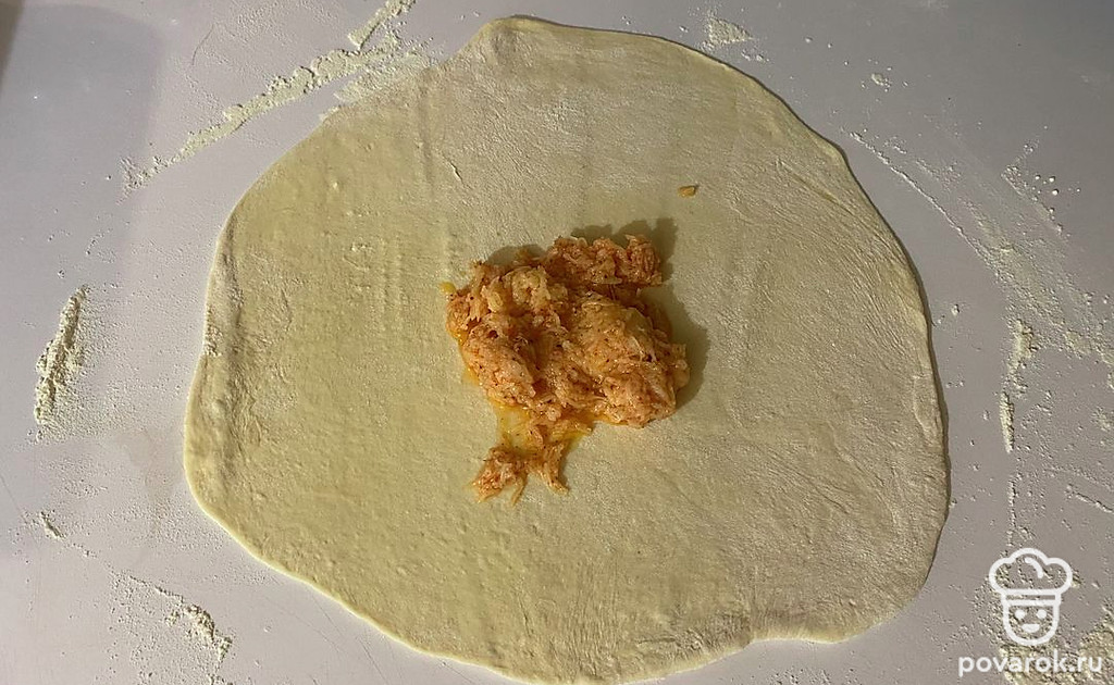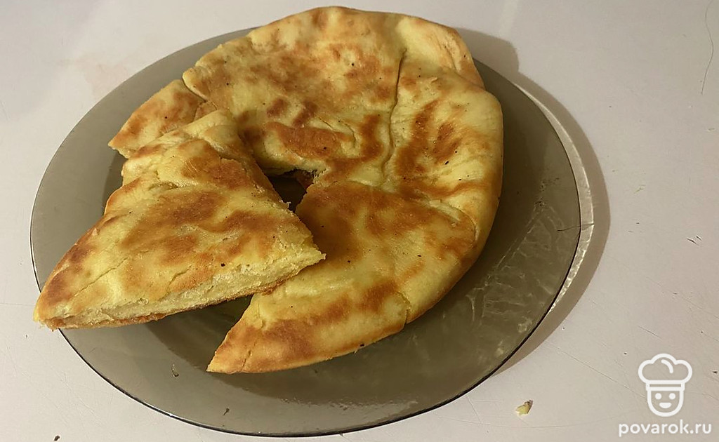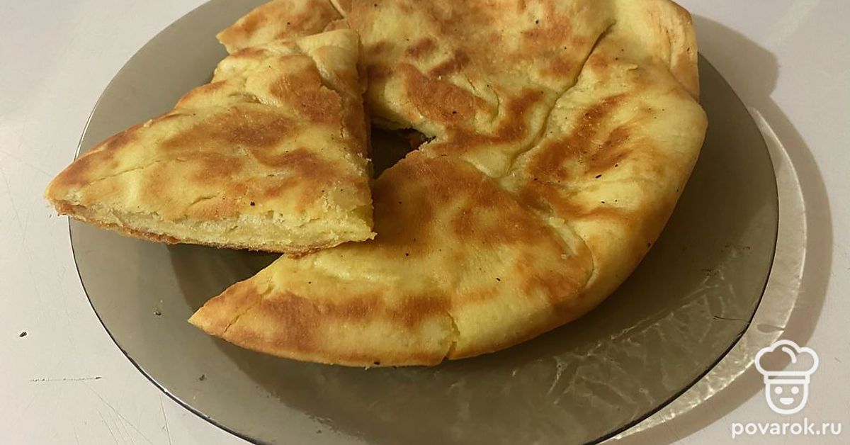 Румяный жаренный на сковороде пирог с сырной начинкой