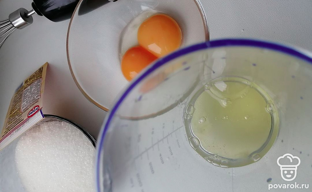 Сбиваем белок до пиков, добавляем сахар и желток. Смешиваем все ингредиенты и добавляем разрыхлитель теста.