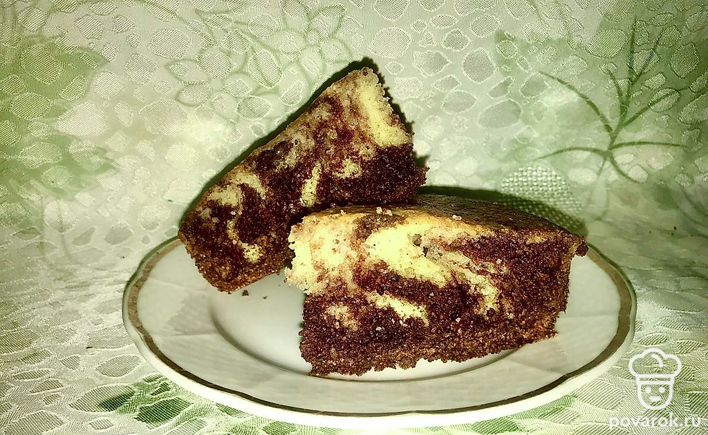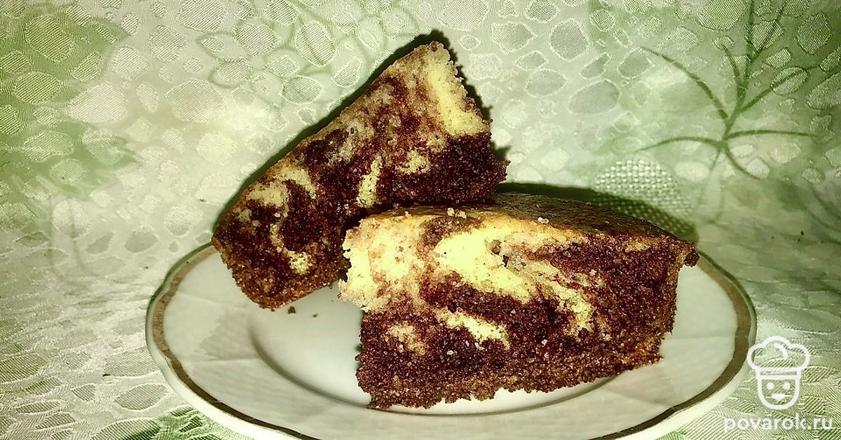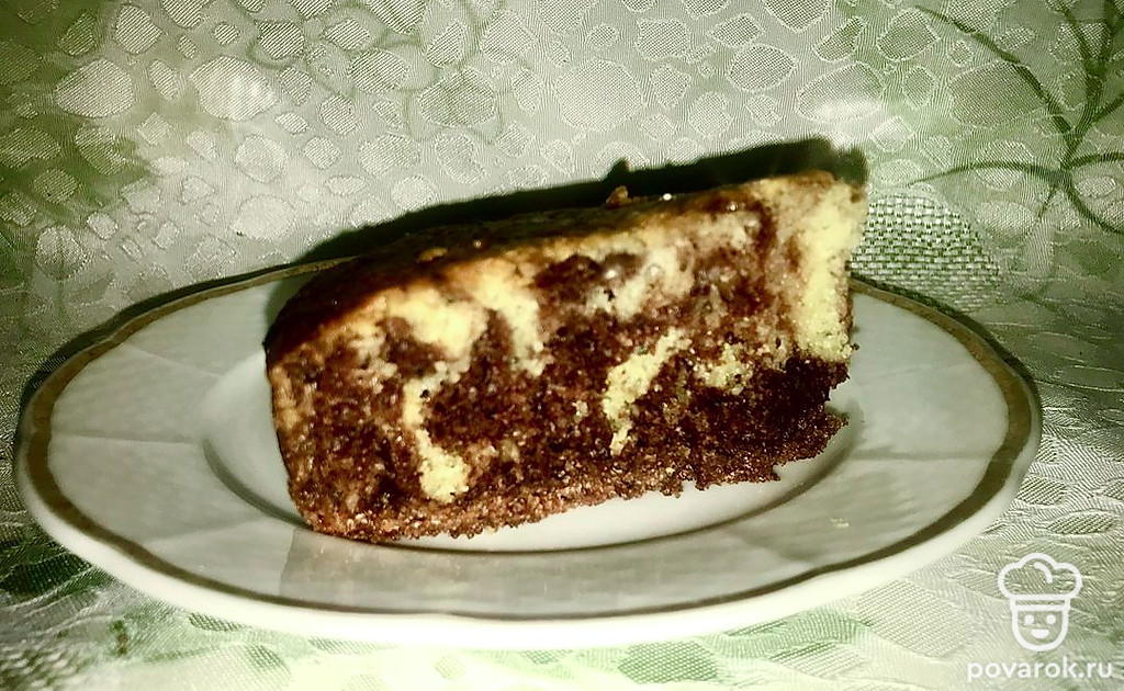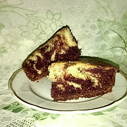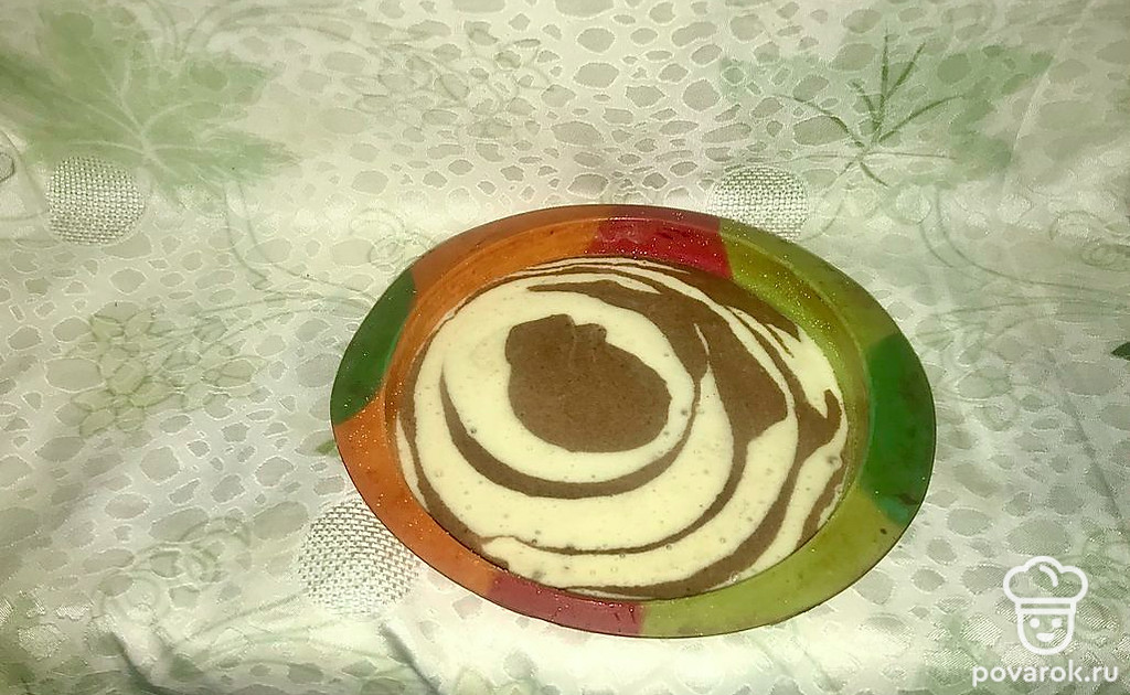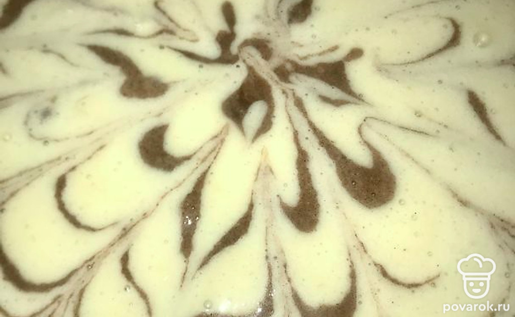 Добавить разрыхлитель и поделить смесь на две части. В одну просеять какао, размешать, в другую добавить ещё одну столовую ложку муки, размешать. Выкладывать поочерёдно, ложку белого теста, ложку темного пока не заполнится вся форма. Форма должна быть 24 см.