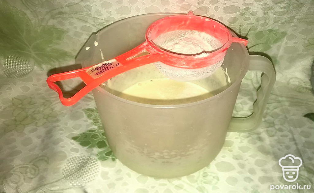 Взбить яйца с сахаром, продолжая взбивать влить масло, добавить набухшую манную крупу. Просеять муку, добавить в яично-масляную смесь.