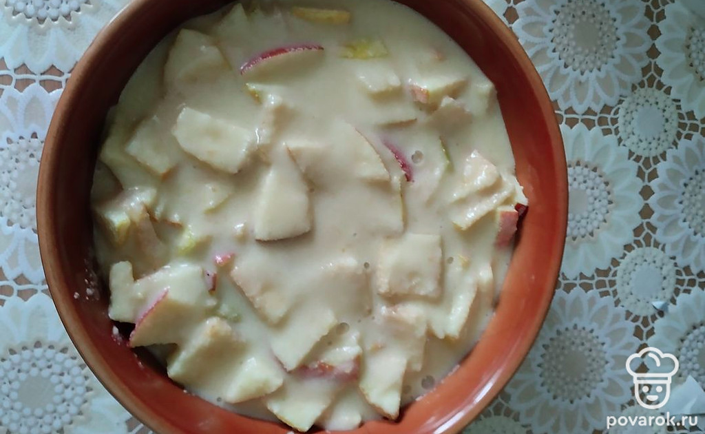 Выложить яблоки в смазанную маслом форму и залить приготовленной смесью.