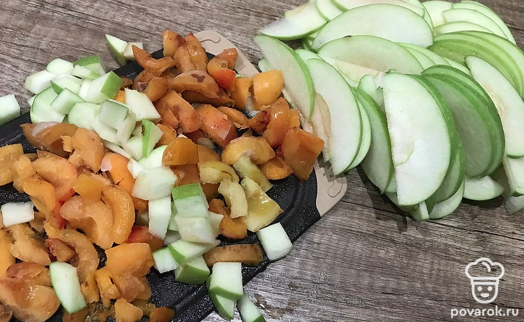 Яблоки нарежьте на красивые дольки, а некрасивые части порежьте произвольно. Абрикосы разморозьте и нарежьте, как хотите.