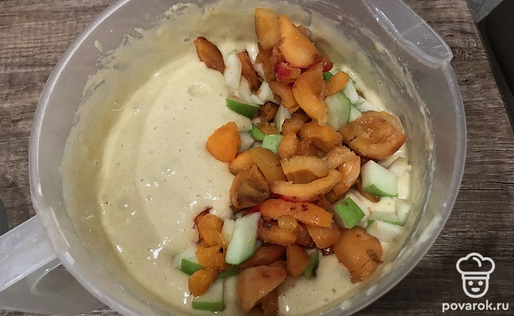 Подготовленные фрукты добавьте в тесто, всыпьте цедру лимона.