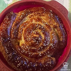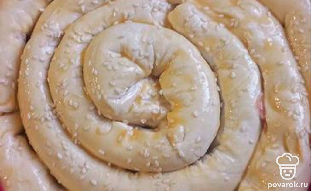 «Колбаски» укладываем в форму в виде улитки, смазываем яйцом и посыпаем кунжутом. Ставим в разогретую до 180 градусов духовку примерно на 40 минут.
