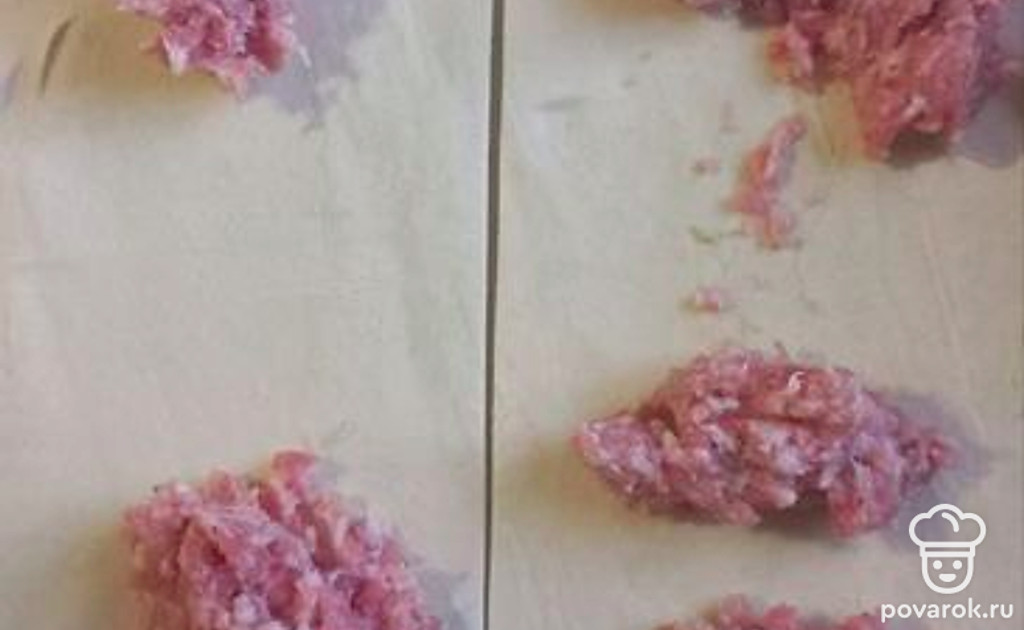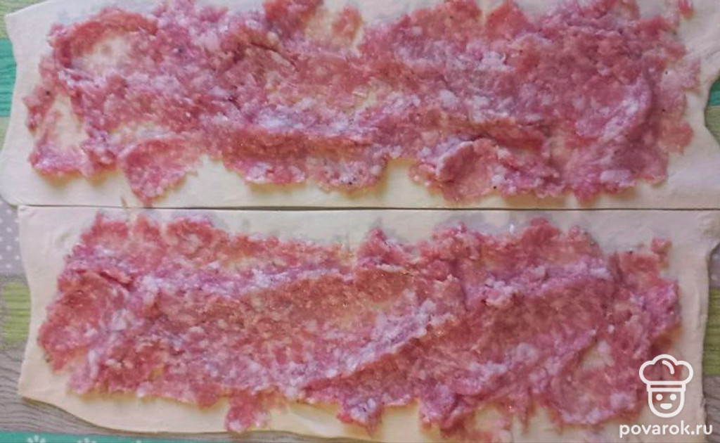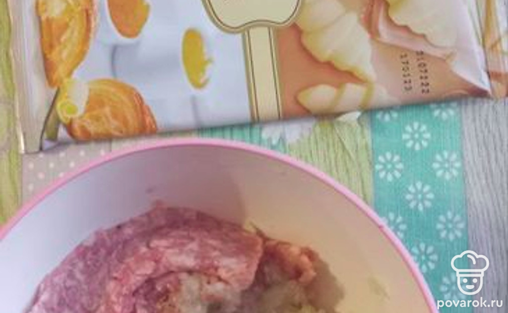 Тесто размораживаем, фарш смешиваем с луком, солью и перцем.