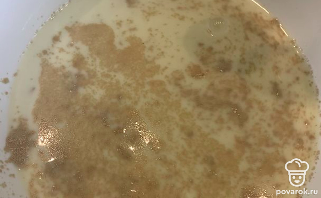 Смешиваем тёплое молоко с дрожжами, солью и сахаром, перемешиваем до растворения дрожжей.