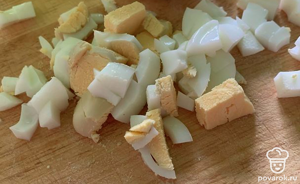 Пока тесто поднимается, делаем начинку: отвариваем яйца и нарезаем на мелкие кубики.