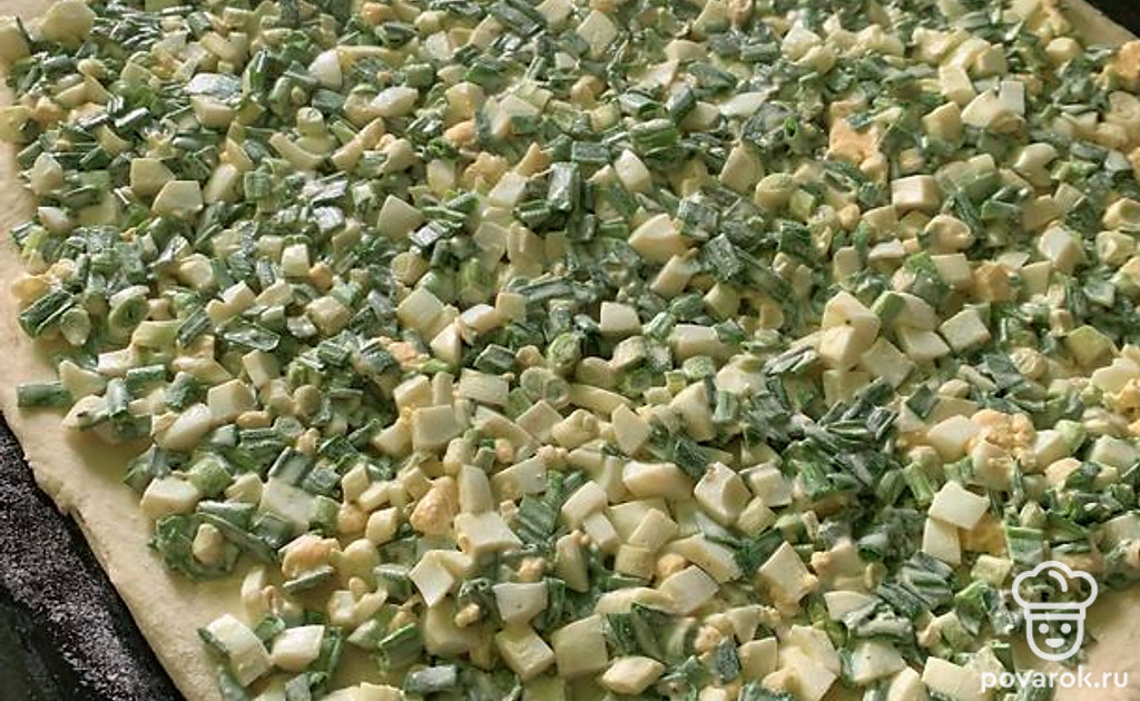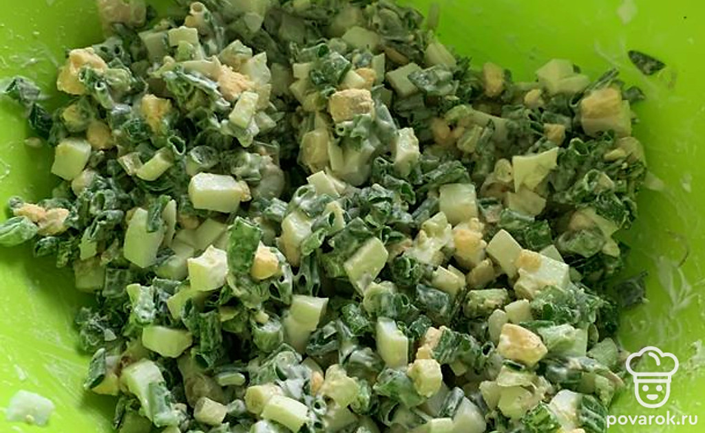 Смешиваем лук и яйца, добавляем соль по вкусу, можно добавить чуть сметаны.