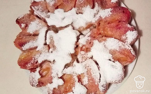 Хурму нарежьте пластинками и выложите на дно формы, затем вылейте тесто и поместите в духовку на 50 минут 180 градусов.