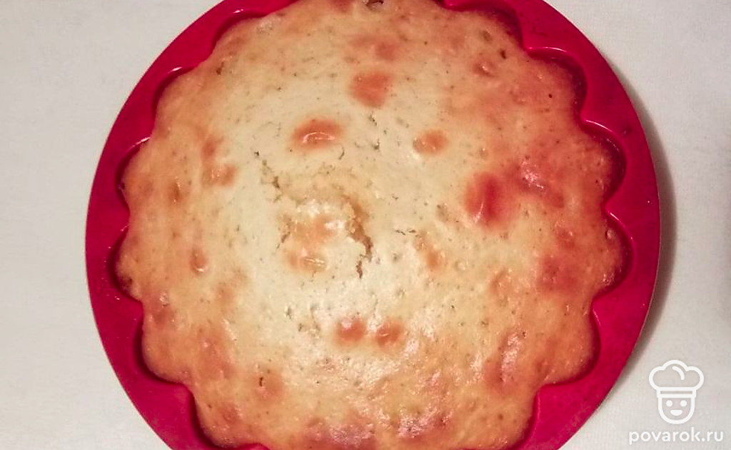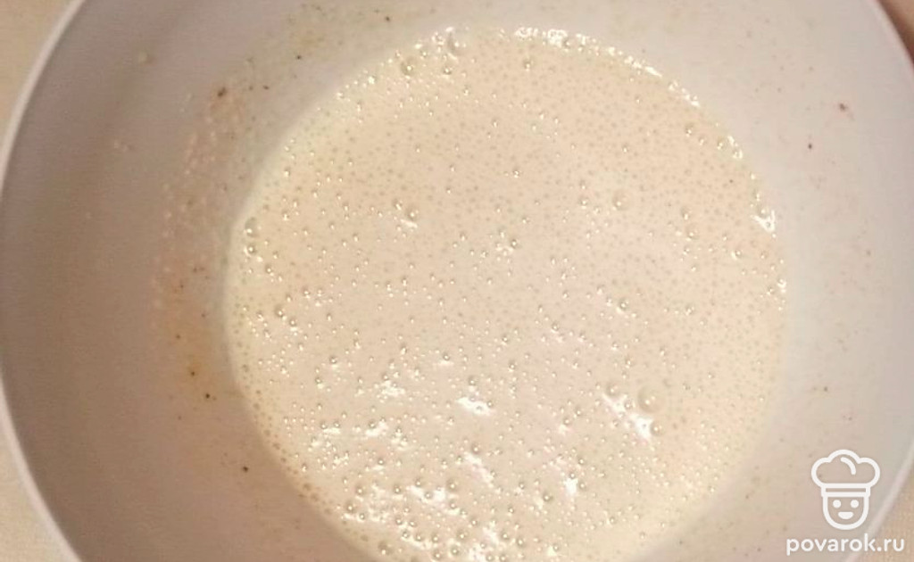 Яйца взбейте в глубокой тарелке, затем налейте мускатный орех и насыпьте сахар. Налейте масло и молоко. Налейте сметану. Тщательно перемешайте. Высыпьте муку вместе с разрыхлителем.