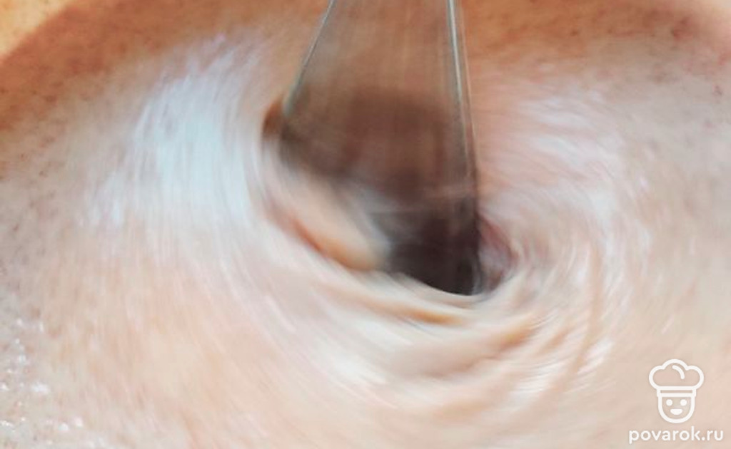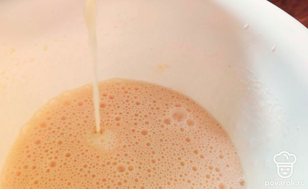После добавляем сюда же теплое, но не горячее молоко с маслом. Перемешиваем.