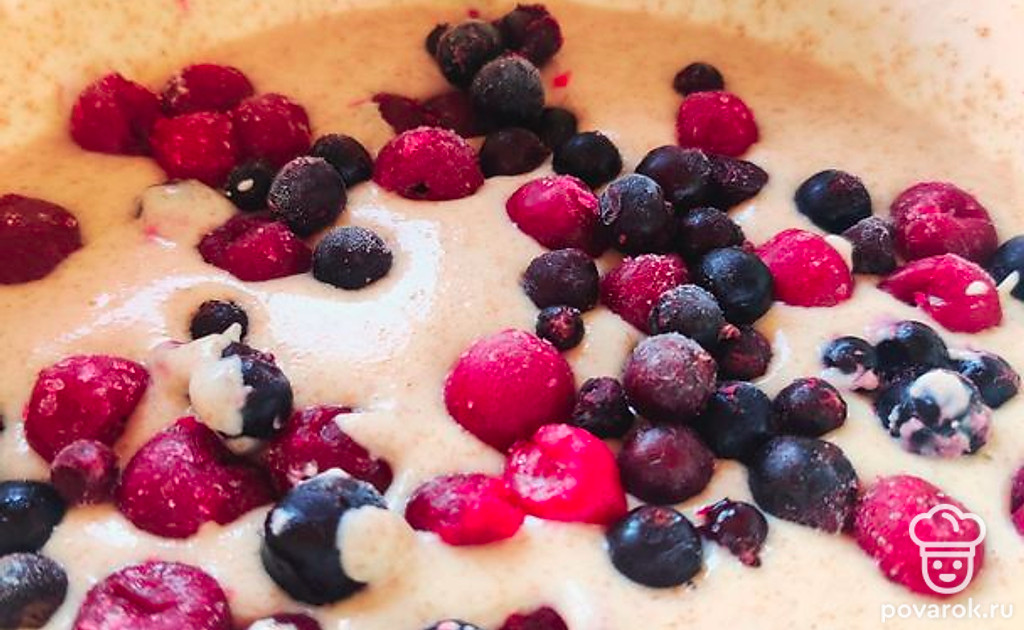 Добавляем мороженные ягоды. У меня это смородина и вишня. Перемешиваем.